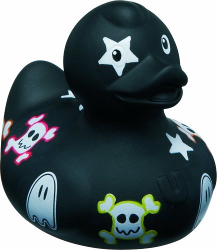 Bud Ducks are the world's most collectible rubber duck. The classic rubber duck has been given a deluxe designer make over by Bud at the DesignRoom. Spooky duck features a black body decorated with white ghosts and skulls and crossbones. It is the perfect gift for the Bud Duck collector. Made from phthalate free PVC. Packaged in a transparent gift box. Not intended for children under 3.