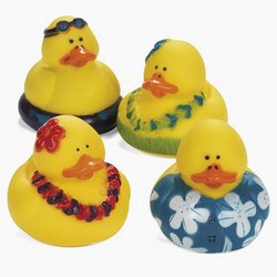Hosting a luau? Imagine the fun kids and adults will have with these. Use them as decorations on your hors d'oeuvre table and let each guest take one home. You'll receive some combination of the following for a total of 12: blue/green ducky with grass hula skirt, red/purple ducky with lei and flower in hair, blue Hawaiian shirt ducky, and purple/blue on float with goggles. They don't squeak, but they do have a tiny hole in their beak for squirting water. These make great party favors, use as cake toppers, or just fun to play with. Each measures approx 2" x 2". They do not float upright.